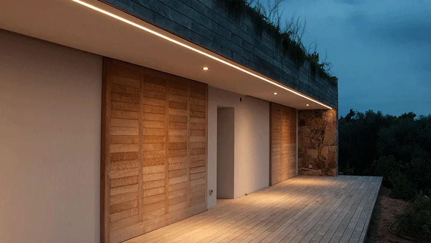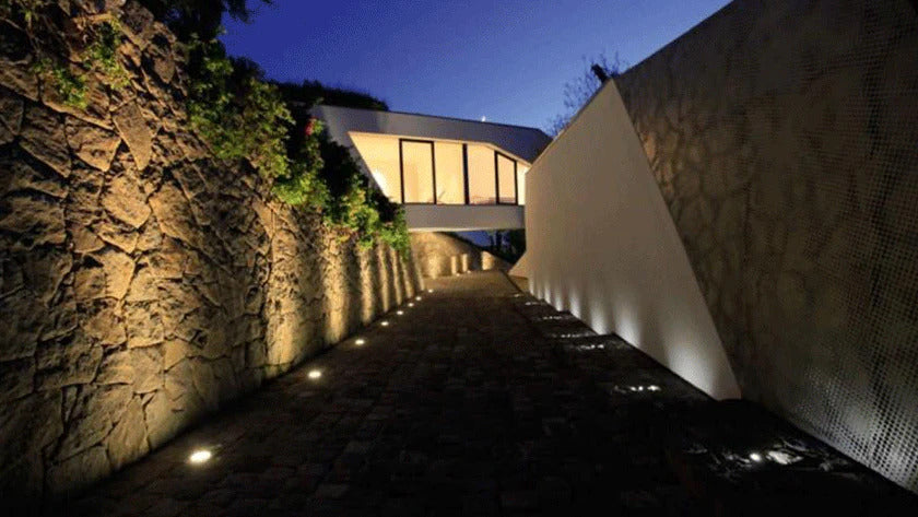 Downlights with a rating of IP44 or higher can be installed under the eaves of a roof to achieve a wall grazing technique. Select a downlight with a narrow beam angle less than 60 degrees, and install close to the wall to gently graze the surface, highlighting textures of brick and stone.
