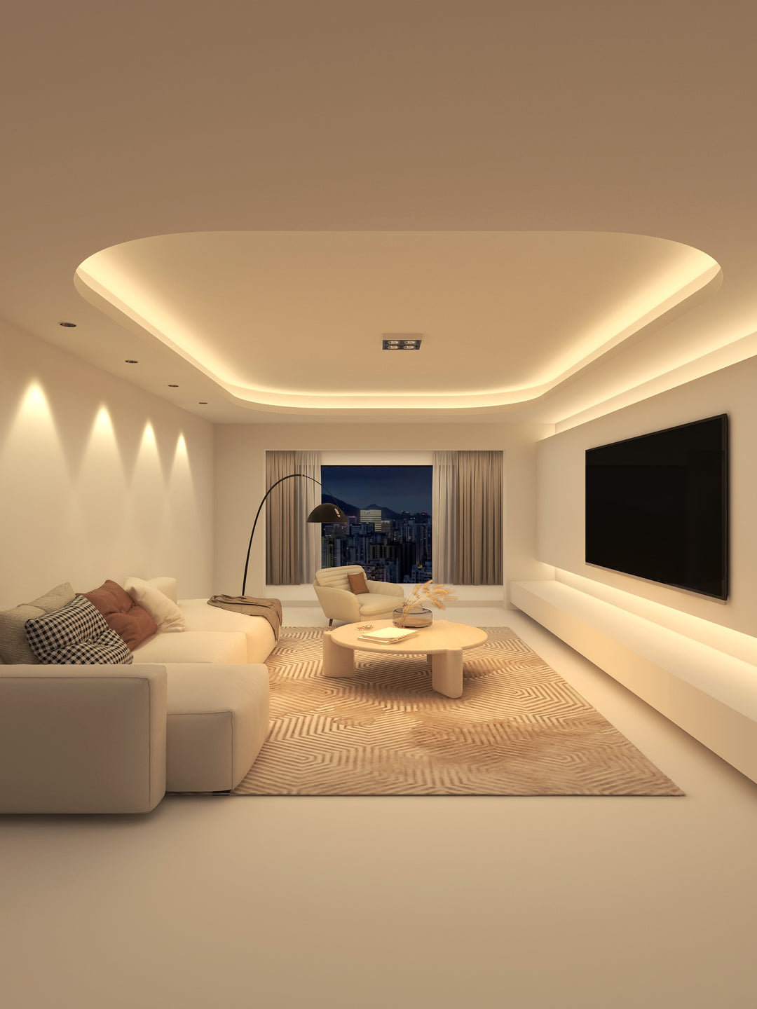 In the living room, magnetic track and strip lights are popular choices, offering effortless adaptability to curate the perfect atmosphere, whether you want a warm glow for movie nights or a brighter setting for gatherings. These sleek lighting options seamlessly blend with the room's modern aesthetic, creating a harmonious and adaptable space.